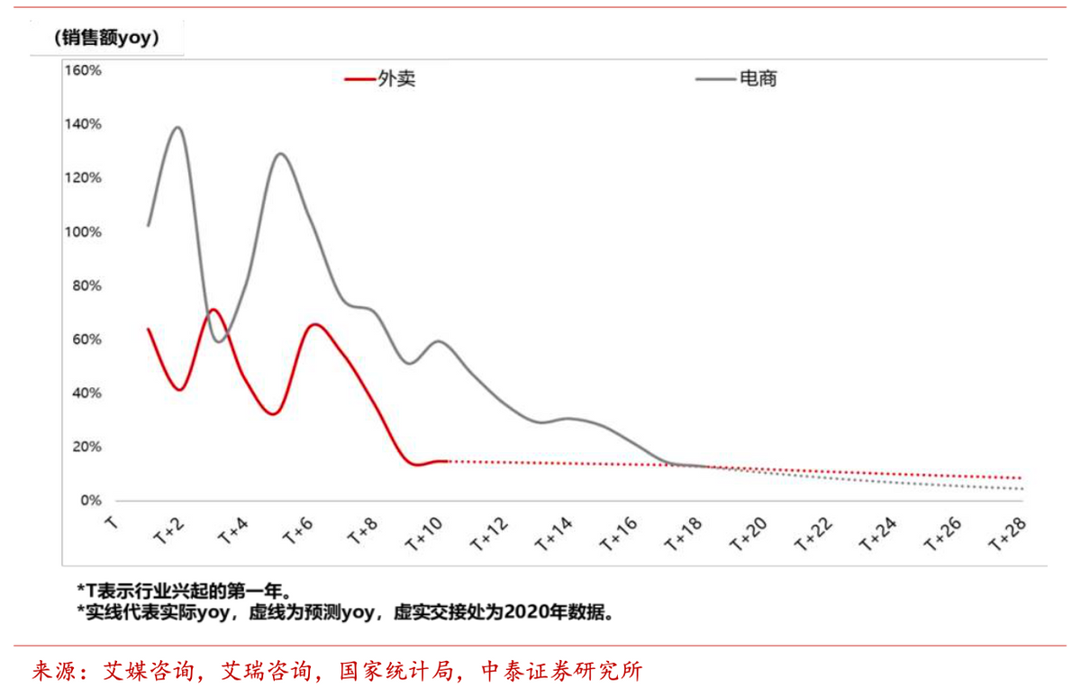 如果站在相同的起始点,画出外卖和电商行业销售额增速的时间序列变化趋势,将呈现不同的形式。